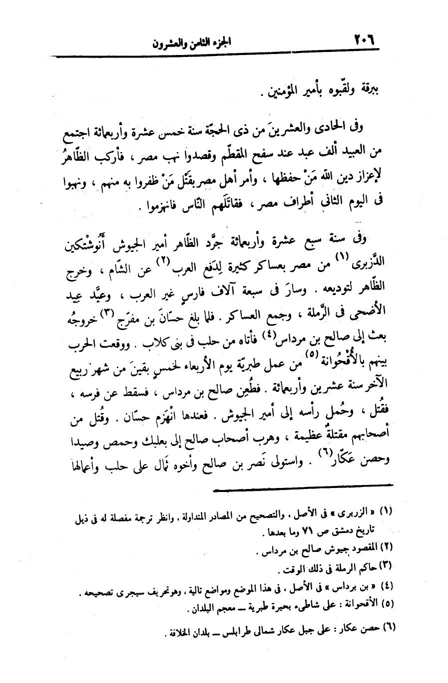 وفى سنة سبع عشرة وأربعمائة جرّد الظّاهر أمير الجيوش أنوشتكين الدّزبرى «1» من مصر بعساكر كثيرة لدفع العرب «2» عن الشّام، وخرج الظّاهر لتوديعه. وسار فى سبعة آلاف فارس غير العرب، وعيّد عيد الأضحى فى الرّملة، وجمع العساكر. فلما بلغ حسّان بن مفرّج «3» خروجه بعث إلى صالح بن مرداس «4» فأتاه من حلب فى بنى كلاب. ووقعت الحرب بينهم بالأقحوانة «5» من عمل طبريّة يوم الأربعاء لخمس بقين من شهر ربيع الآخر سنة عشرين وأربعمائة. فطعن صالح بن مرداس، فسقط عن فرسه، فقتل، وحمل رأسه إلى أمير الجيوش. فعندها انهزم حسّان. وقتل من أصحابهم مقتلة عظيمة، وهرب أصحاب صالح إلى بعلبك وحمص وصيدا وحصن عكّار «6» . واستولى نصر بن صالح وأخوه ثمال على حلب وأعمالها