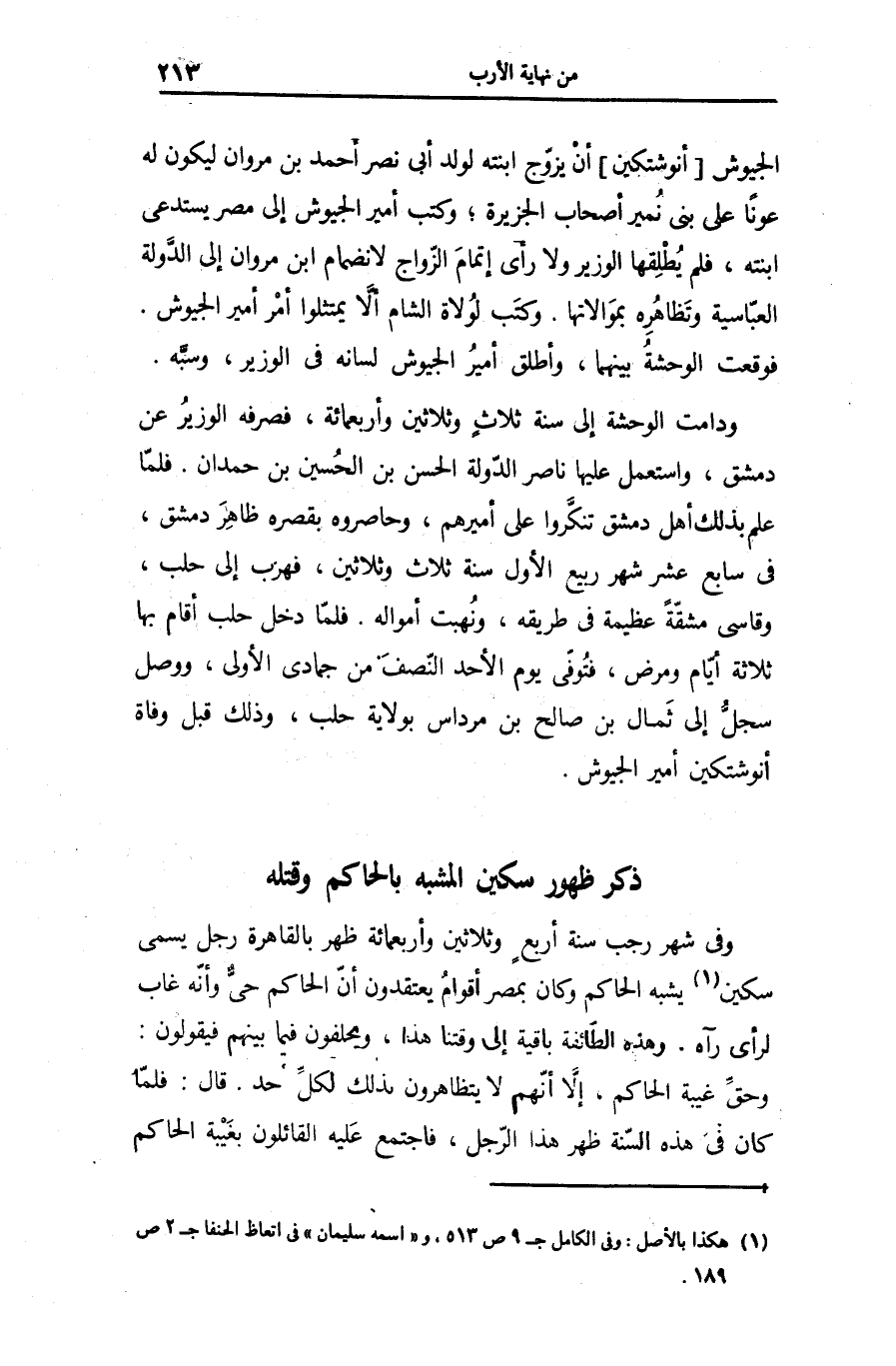 وفى شهر رجب سنة أربع وثلاثين وأربعمائة ظهر بالقاهرة رجل يسمى سكين «1» يشبه الحاكم وكان بمصر أقوام يعتقدون أنّ الحاكم حىّ وأنّه غاب لرأى رآه. وهذه الطّائفة باقية إلى وقتنا هذا، ويحلفون فيما بينهم فيقولون: