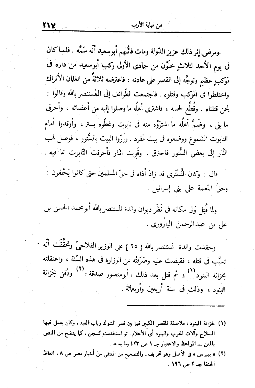 وحقدت والدة المستنصر بالله [65] على الوزير الفلاحىّ وتحقّقت أنّه تسبّب فى قتله، فقبضت عليه وصرفته عن الوزارة فى هذه السّنة، واعتقلته بخزانة البنود «1» ؛ ثم قتل بعد ذلك «أبو منصور صدقة» «2» ودفن بخزانة البنود، وذلك فى سنة أربعين وأربعمائة.