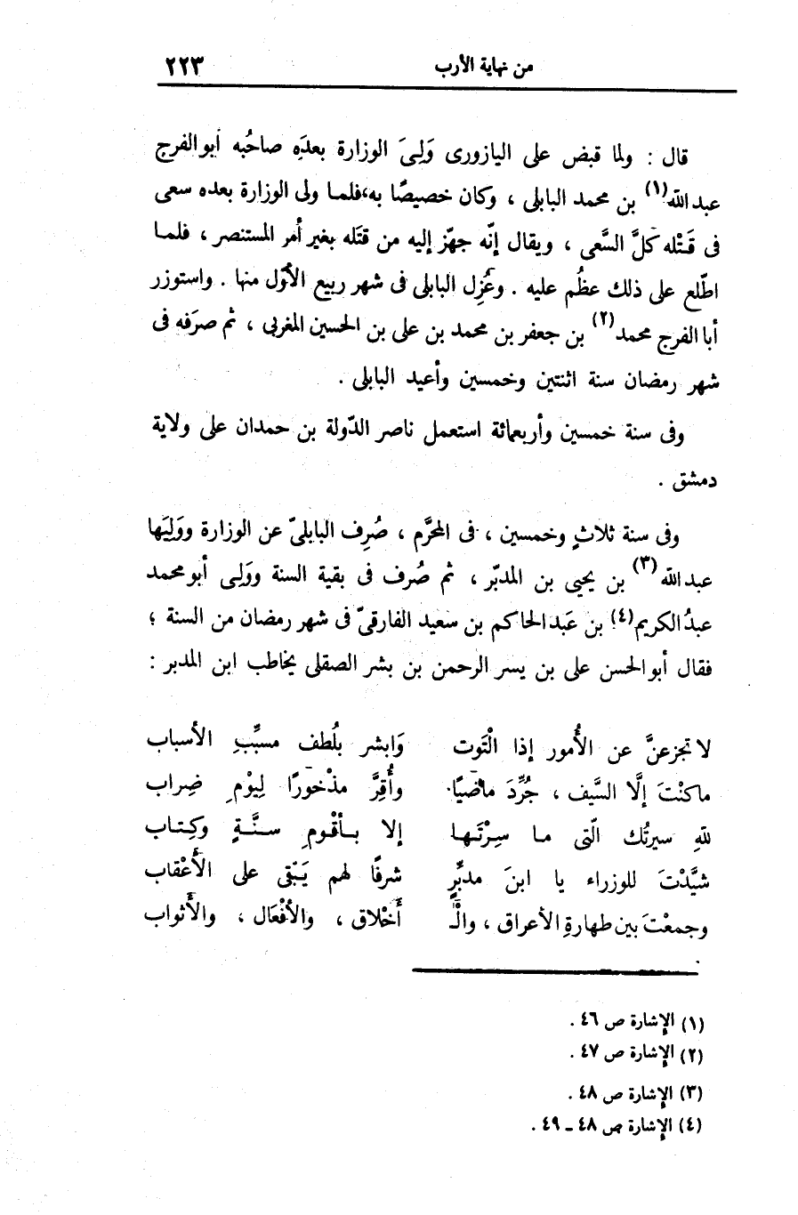 وفى سنة ثلاث وخمسين، فى المحرّم، صرف البابلىّ عن الوزارة ووليها عبد الله «3» بن يحيى بن المدبّر، ثم صرف فى بقية السنة وولى أبو محمد عبد الكريم «4» بن عبد الحاكم بن سعيد الفارقىّ فى شهر رمضان من السنة؛ فقال أبو الحسن على بن يسر الرحمن بن بشر الصقلى يخاطب ابن المدبر: