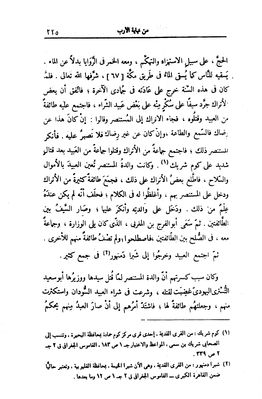 الحجّ، على سبيل الاستهزاء والتهكّم، ومعه الخمر فى الرّوايا بدلا عن الماء، يسقيه للنّاس كما يسقى الماء فى طريق مكّة [67] ، شرّفها الله تعالى. فلمّا كان فى هذه السّنة خرج على عادته فى جمادى الآخرة؛ فاتّفق أن بعض الأتراك جرّد سيفا على سكر منه على بعض عبيد الشّراء، فاجتمع عليه طائفة من العبيد وقتلوه، فجاء الاتراك إلى المستنصر وقالوا: إن كان هذا عن رضاك فالسّمع والطاعة، وإنّ كان عن غير رضاك فلا نصبر عليه. فأنكر المستنصر ذلك؛ فاجتمع جماعة من الأتراك وقتلوا جماعة من العبيد بعد قتال شديد على كوم شريك «1» . وكانت والدة المستنصر تعين العبيد بالأموال والسّلاح، فاطّلع بعض الأتراك على ذلك، فجمع طائفة كثيرة من الأتراك ودخل على المستنصر بهم، وأغلظوا له فى الكلام؛ فحلف أنّه لم يكن عنده علم من ذلك. ودخل على والدته وأنكر عليها؛ وصار السّيف بين الطّائفتين. ثمّ سعى أبو الفرج بن المغربى، الّذى كان يلى الوزارة، وجماعة معه، فى الصّلح بين الطّائفتين، فاصطلحوا؛ ولم تصف طائفة منهم للأخرى.