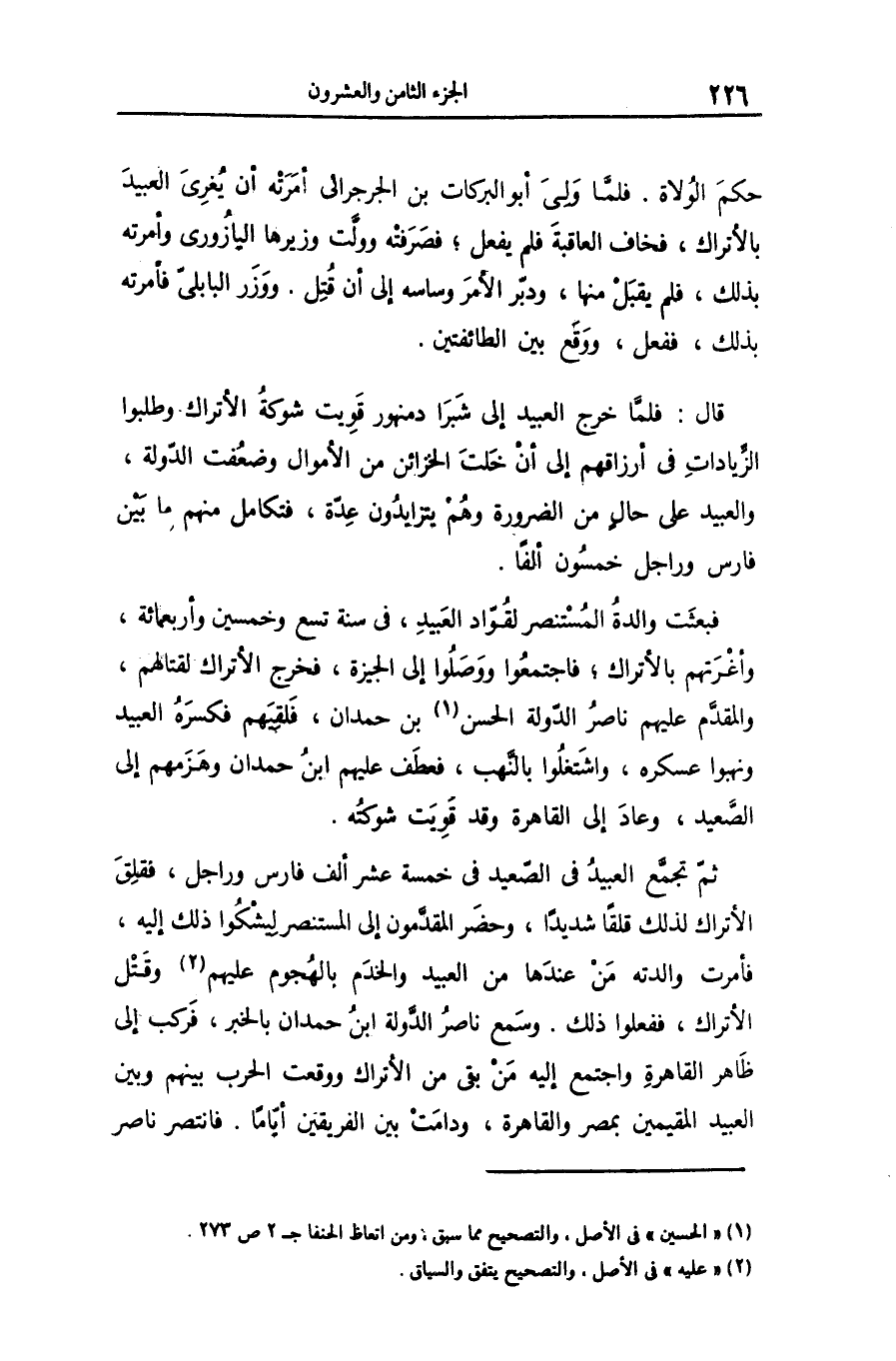 ثمّ تجمّع العبيد فى الصّعيد فى خمسة عشر ألف فارس وراجل، فقلق الأتراك لذلك قلقا شديدا، وحضر المقدّمون إلى المستنصر ليشكوا ذلك إليه، فأمرت والدته من عندها من العبيد والخدم بالهجوم عليهم «2» وقتل الأتراك، ففعلوا ذلك. وسمع ناصر الدّولة ابن حمدان بالخبر، فركب إلى ظاهر القاهرة واجتمع إليه من بقى من الأتراك ووقعت الحرب بينهم وبين العبيد المقيمين بمصر والقاهرة، ودامت بين الفريقين أيّاما. فانتصر ناصر