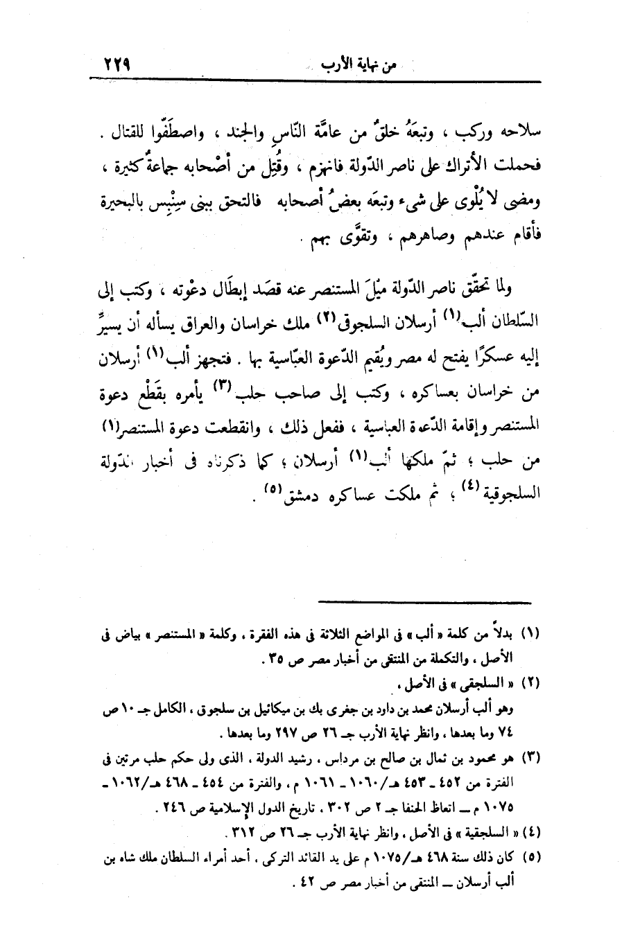 ولما تحقّق ناصر الدّولة ميل المستنصر عنه قصد إبطال دعوته، وكتب إلى السّلطان ألب «1» أرسلان السلجوقى «2» ملك خراسان والعراق يسأله أن يسيّر إليه عسكرا يفتح له مصر ويقيم الدّعوة العبّاسية بها. فتجهز ألب أرسلان من خراسان بعساكره، وكتب إلى صاحب حلب «3» يأمره بقطع دعوة المستنصر وإقامة الدّعوة العباسية، ففعل ذلك، وانقطعت دعوة المستنصر «4» من حلب؛ ثمّ ملكها ألب أرسلان؛ كما ذكرناه فى أخبار الدّولة السلجوقية «5» ؛ ثم ملكت عساكره دمشق «6» .