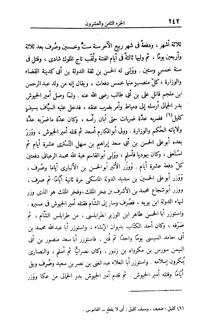 ثلاثة أشهر، ودفعة فى شهر ربيع الآخر سنة ستّ وخمسين وصرف بعد ثلاثة وأربعين يوما، ثم وليها ثالثة فى أيام الفتنة ولقّب تاج الملوك شادى، وقتل فى سنة خمس وستين. وولى له الحسن بن ثقة الدولة بن أبى كدينة القضاء والوزارة، كلّ منصب منها خمس دفعات، ويقال إنه من ولد عبد الرحمن ابن ملجم قاتل على بن أبى طالب رضى الله عنه. ولمّا وصل أمير الجيوش بدر الجمالى أرسله إلى دمياط وأمر بضرب عنقه، فدخل عليه السيّاف بسيف كليل «1» فضربه عدّة ضربات حتى أبان رأسه، وكان عدّة ما ضربه عدّة ولاياته الحكم والوزارة. وولى أبو المكارم أسعد ثم قتله أمير الجيوش، ووزر بعده أبو على الحسن بن أبى سعد إبراهيم بن سهل التّسترى عشرة أيام ثم استعفى، وكان يهوديا فأسلم، وولى أبو القاسم هبة الله محمد الرعبانى دفعتين كلّ دفعة عشرة أيام. ووزر الأثير أبو الحسن بن الأنبارى أياما وصرف، ووزر أبو على الحسين بن سديد الدولة الماسكى مرة ثانية أيّاما ثم صرف، ووزر أبو شجاع محمد بن الأشرف بن فخر الملك، وفخر الملك هو الذى وزر لبهاء الدولة ابن بويه، فصرف وسار إلى الشّام فقتله أمير الجيوش فى مسيره.