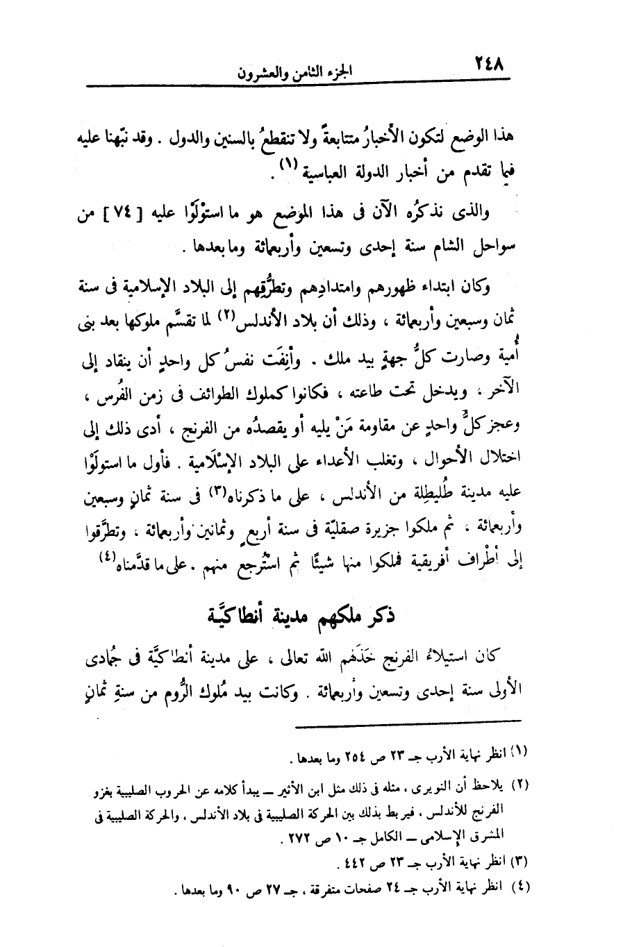 وكان ابتداء ظهورهم وامتدادهم وتطرّقهم إلى البلاد الإسلامية فى سنة ثمان وسبعين وأربعمائة، وذلك أن بلاد الأندلس «2» لما تقسّم ملوكها بعد بنى أمية وصارت كلّ جهة بيد ملك، وأنفت نفس كل واحد أن ينقاد إلى الآخر، ويدخل تحت طاعته، فكانوا كملوك الطوائف فى زمن الفرس، وعجز كلّ واحد عن مقاومة من يليه أو يقصده من الفرنج، أدى ذلك إلى اختلال الأحوال، وتغلب الأعداء على البلاد الإسلامية. فأول ما استولوا عليه مدينة طليطلة من الأندلس، على ما ذكرناه «3» فى سنة ثمان وسبعين وأربعمائة، ثم ملكوا جزيرة صقليّة فى سنة أربع وثمانين وأربعمائة، وتطرّقوا إلى أطراف أفريقية فملكوا منها شيئا ثم استرجع منهم، على ما قدّمناه «4»