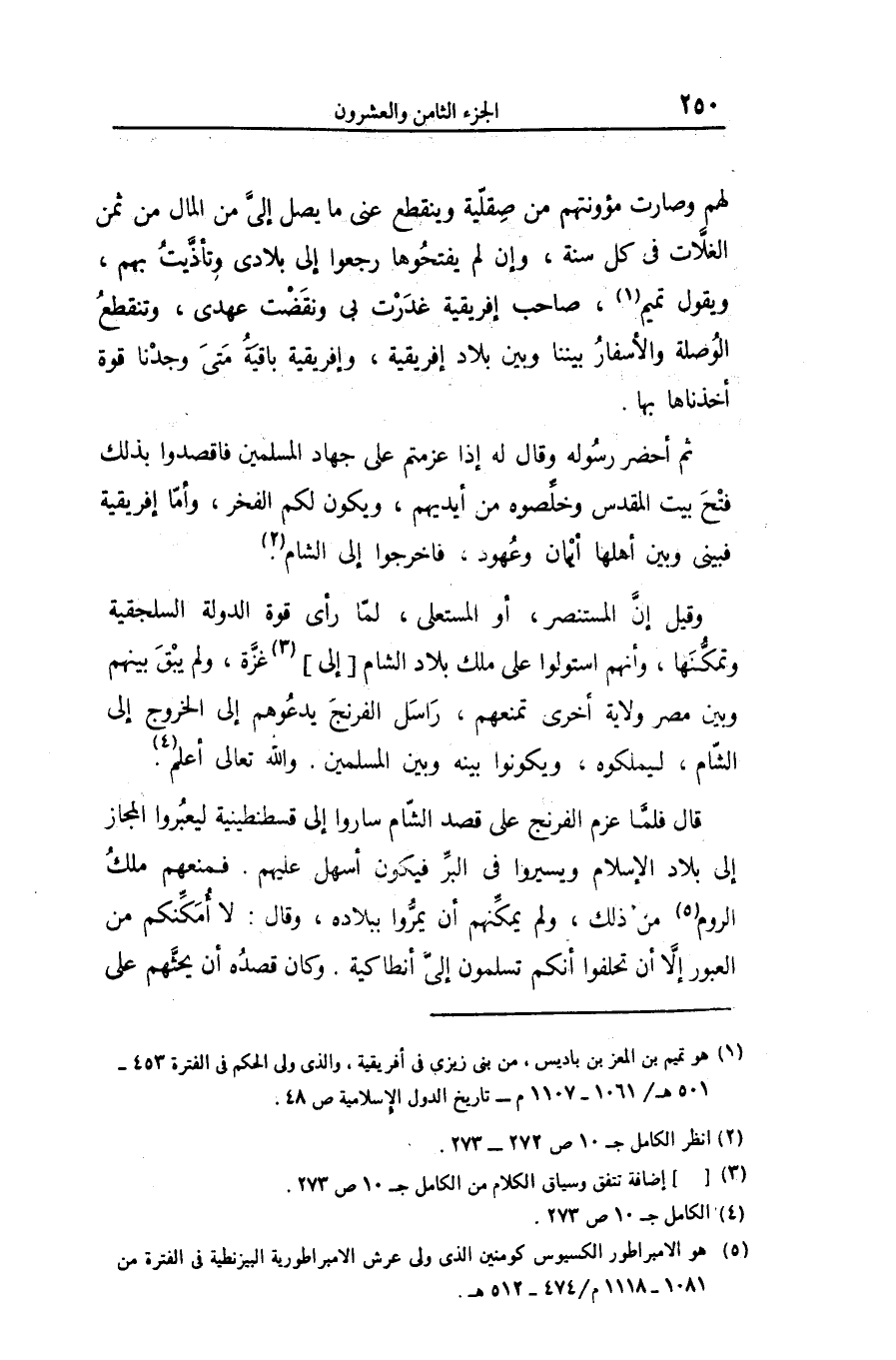 ثم أحضر رسوله وقال له إذا عزمتم على جهاد المسلمين فاقصدوا بذلك فتح بيت المقدس وخلّصوه من أيديهم، ويكون لكم الفخر، وأمّا إفريقية فبينى وبين أهلها أيمان وعهود، فاخرجوا إلى الشام. «2»