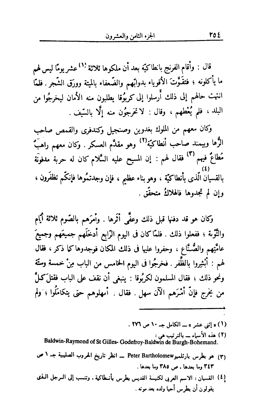 وكان معهم من الملوك بغدوين وصنجيل وكندفرى والقمص صاحب الرّها وبيمند صاحب أنطاكيّة «2» وهو مقدّم العسكر. وكان معهم راهب مطاع فيهم «3» فقال لهم: إن المسيح عليه السّلام كان له حربة مدفونة بالقسيان «4» الّذى بأنطاكيّة، وهو بناء عظيم، فإن وجدتموها فإنّكم تظفرون، وإن لم تجدوها فالهلاك متحقّق.