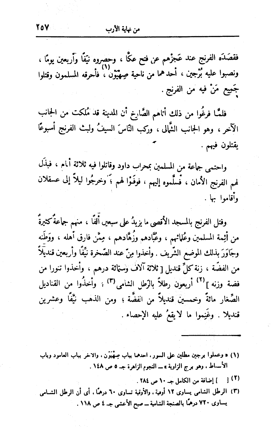 وقتل الفرنج بالمسجد الأقصى ما يزيد على سبعين ألفا، منهم جماعة كثيرة من أئمة المسلمين وعلمائهم، وعبّادهم وزهّادهم، ممّن فارق أهله، ووطنه وجاور بذلك الموضع الشّريف. وأخذوا منّ عند الصّخرة نيّفا وأربعين قنديلا من الفضّة، زنة كلّ قنديل [ثلاثة آلاف وستمائة درهم، وأخذوا تنورا من فضة وزنه] «2» أربعون رطلا بالرّطل الشامى «3» ؛ وأخذوا من القناديل الصّغار مائة وخمسين قنديلا من الفضّة؛ ومن الذهب نيّفا وعشرين قنديلا. وغنموا ما لا يقع عليه الإحصاء.