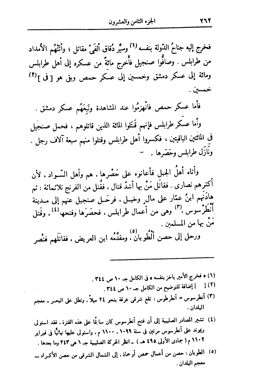 وأتاه أهل الجبل فأعانوه على حصرها، هم وأهل السّواد، لأن أكثرهم نصارى. فقاتل من بها أشدّ قتال، فقتل من الفرنج ثلاثمائة: ثم هادنهم ابن عمّار على مال وخيل، فرحل صنجيل عنهم إلى مدينة أنطرسوس، «3» وهى من أعمال طرابلس، فحصرها وفتحها «4» ، وقتل من بها من المسلمين.