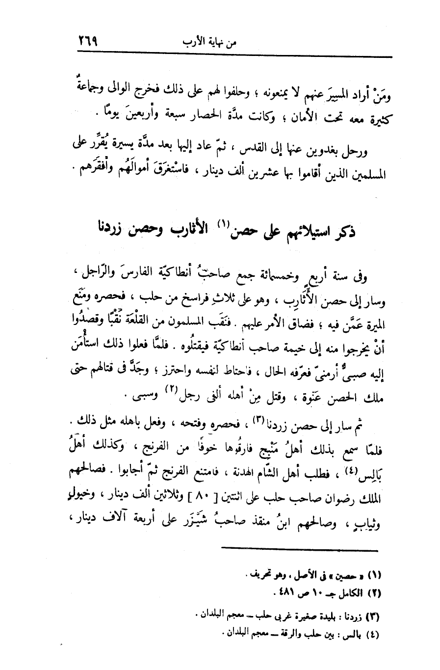 وفى سنة أربع وخمسمائة جمع صاحب أنطاكيّة الفارس والرّاجل، وسار إلى حصن الأثارب، وهو على ثلاث فراسخ من حلب، فحصره ومنع الميرة عمّن فيه؛ فضاق الأمر عليهم. فنقب المسلمون من القلعة نقبا وقصدوا أن يخرجوا منه إلى خيمة صاحب أنطاكيّة فيقتلوه. فلمّا فعلوا ذلك استأمن إليه صبىّ أرمنىّ فعرّفه الحال، فاحتاط لنفسه واحترز؛ وجدّ فى قتالهم حتى ملك الحصن عنوة، وقتل من أهله ألفى رجل «2» وسبى.