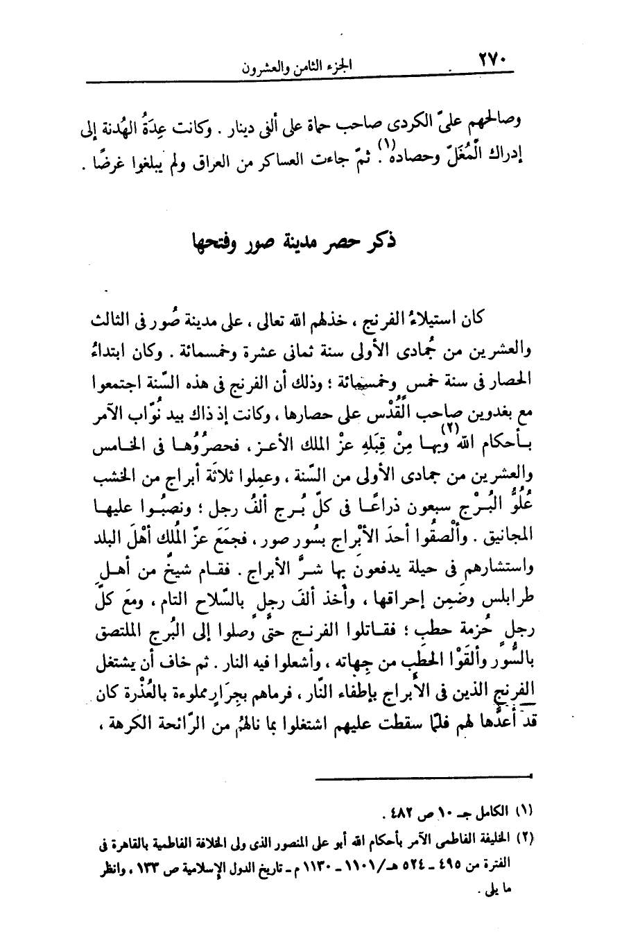 كان استيلاء الفرنج، خذلهم الله تعالى، على مدينة صور فى الثالث والعشرين من جمادى الأولى سنة ثمانى عشرة وخمسمائة. وكان ابتداء الحصار فى سنة خمس وخمسمائة؛ وذلك أن الفرنج فى هذه السّنة اجتمعوا مع بغدوين صاحب القدس على حصارها، وكانت إذ ذاك بيد نوّاب الآمر بأحكام الله «2» وبها من قبله عز الملك الأعز، فحصروها فى الخامس والعشرين من جمادى الأولى من السّنة، وعملوا ثلاثة أبراج من الخشب علوّ البرج سبعون ذراعا فى كلّ برج ألف رجل؛ ونصبوا عليها المجانيق. وألصقوا أحد الأبراج بسور صور، فجمع عزّ الملك أهل البلد واستشارهم فى حيلة يدفعون بها شرّ الأبراج. فقام شيخ من أهل طرابلس وضمن إحراقها، وأخذ ألف رجل بالسّلاح التام، ومع كلّ رجل حزمة حطب؛ فقاتلوا الفرنج حتّى وصلوا إلى البرج الملتصق بالسّور وألقوا الحطب من جهاته، وأشعلوا فيه النار. ثم خاف أن يشتغل الفرنج الذين فى الأبراج بإطفاء النّار، فرماهم بجرار مملوءة بالعذرة كان قد أعدّها لهم فلمّا سقطت عليهم اشتغلوا بما نالهم من الرّائحة الكرهة،
