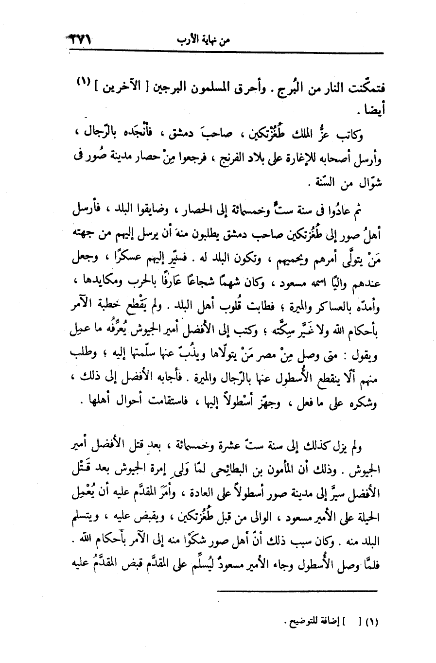 ثم عادوا فى سنة ستّ وخمسمائة إلى الحصار، وضايقوا البلد، فأرسل أهل صور إلى طغزتكين صاحب دمشق يطلبون منه أن يرسل إليهم من جهته من يتولّى أمرهم ويحميهم، وتكون البلد له. فسيّر إليهم عسكرا، وجعل عندهم واليا اسمه مسعود، وكان شهما شجاعا عارفا بالحرب ومكايدها، وأمدّه بالعساكر والميرة؛ فطابت قلوب أهل البلد. ولم يقطع خطبة الآمر بأحكام الله ولا غيّر سكّته؛ وكتب إلى الأفضل أمير الجيوش يعرّفه ما عمل ويقول: متى وصل من مصر من يتولّاها ويذبّ عنها سلّمتها إليه؛ وطلب منهم ألّا ينقطع الأسطول عنها بالرّجال والميرة. فأجابه الأفضل إلى ذلك، وشكره على ما فعل، وجهّز أسطولا إليها، فاستقامت أحوال أهلها.