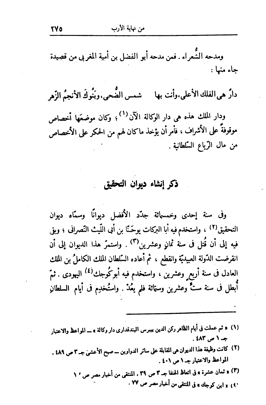 وفى سنة إحدى وخمسمائة جدّد الأفضل ديوانا وسمّاه ديوان التحقيق «2» ، واستخدم فيه أبا البركات يوحنّا بن أبى اللّيث النّصرانى؛ وبقى فيه إلى أن قتل فى سنة ثمان وعشرين «3» . واستمرّ هذا الديوان إلى أن انقرضت الدّولة العبيديّة وانقطع، ثم أعاده السّلطان الملك الكامل بن الملك العادل فى سنة أربع وعشرين، واستخدم فيه أبو كوجك «4» اليهودى. ثمّ أبطل فى سنة ستّ وعشرين وستمائة فلم يعد. واستخدم فى أيام السلطان