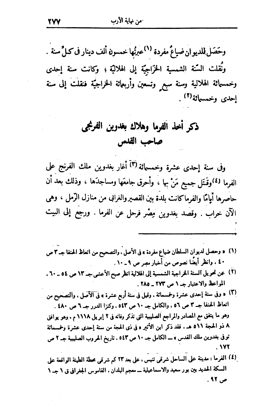 وفى سنة إحدى عشرة وخمسمائة «3» أغار بغدوين ملك الفرنج على الفرما «4» وقتل جميع من بها، وأحرق جامعها ومساجدها، وذلك بعد أن حاصرها أياما والفرما كانت بلدة بين القصير والغرابى من منازل الرّمل، وهى الآن خراب. وقصد بغدوين مصر فرحل عن الفرما. ورجع إلى البيت