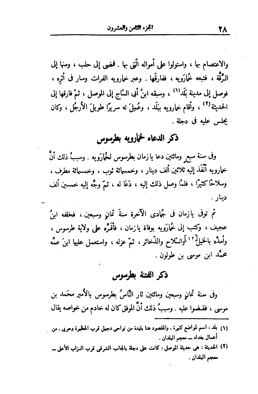 وفى سنة ثمان وسبعين ومائتين ثار النّاس بطرسوس بالأمير محمد بن موسى، فقضوا عليه. وسبب ذلك أنّ الموفق كان له خادم من خواصه يقال