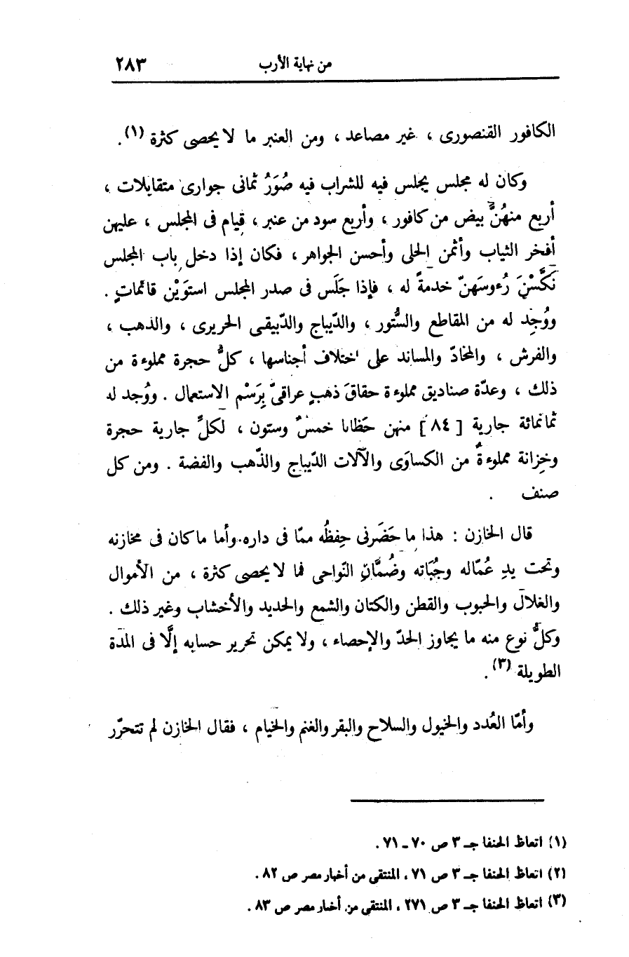 ووجد له من المقاطع والسّتور، والدّيباج والدّبيقى الحريرى، والذهب، والفرش، والمخادّ والمساند على اختلاف أجناسها، كلّ حجرة مملوءة من ذلك، وعدّة صناديق مملوءة حقاق ذهب عراقىّ برسم الاستعمال. ووجد له ثمانمائة جارية [84] منهن حظانا خمس وستون، لكلّ جارية حجرة وخزانة مملوءة من الكساوى والآلات الدّيباج والذّهب والفضة. ومن كل صنف. «2»