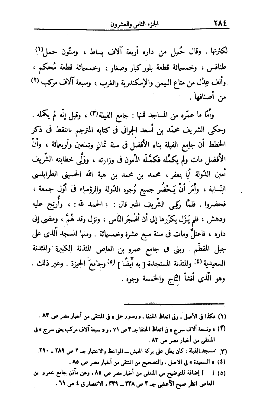 وحكى الشريف محمّد بن أسعد الجوانى فى كتابه المترجم بالنقط فى ذكر الخطط أن جامع الفيلة بناه الأفضل فى سنة ثمان وتسعين وأربعمائة، وأنّ الأفضل مات ولم يكمّله فكمّله المأمون فى وزارته، وولّى خطابته الشّريف أمين الدّولة أبا جعفر، محمد بن محمد بن هبة الله الحسينى الطرابلسى النّسابة، وأمر أن يحضر جميع وجوه الدّولة والرؤساء فى أوّل جمعة، فحضروا. فلمّا رقى الشّريف المنبر قال: «الحمد لله» ، وأرتج عليه ودهش، فلم يزل يكرّرها إلى أن أضجر النّاس، ونزل وقد همّ، ومضى إلى داره، فاعتلّ ومات فى سنة سبع عشرة وخمسمائة. ومنها المسجد الّذى على جبل المقطّم. وبنى فى جامع عمرو بن العاص المئذنة الكبيرة والمئذنة السعيدية «4» والمئذنة المستجدة [به أيضا] «5» وجامع الجيزة. وغير ذلك.