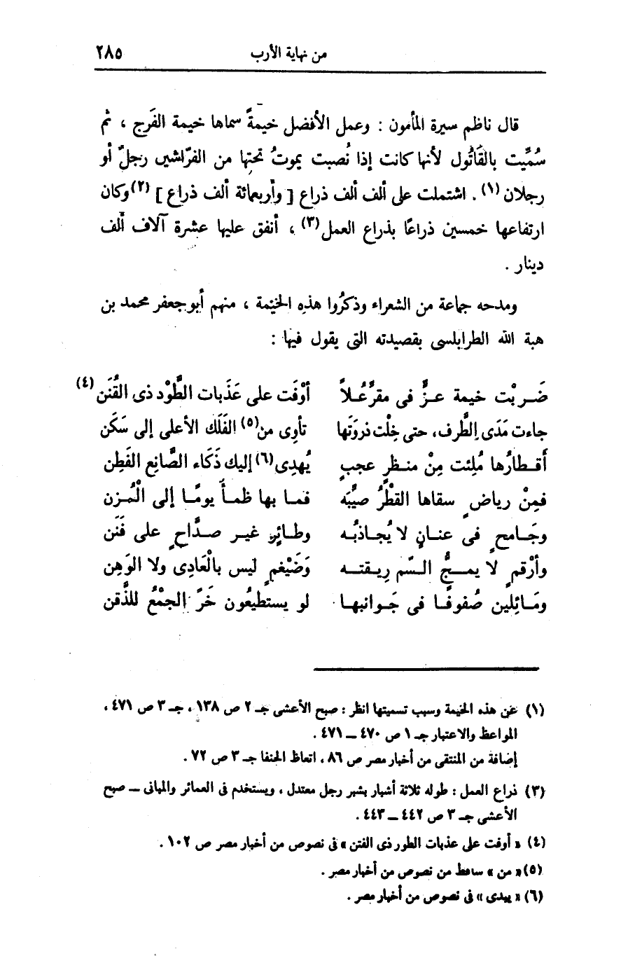 قال ناظم سيرة المأمون: وعمل الأفضل خيمة سماها خيمة الفرج، ثم سمّيت بالقاتول لأنها كانت إذا نصبت يموت تحتها من الفرّاشين رجل أو رجلان «1» . اشتملت على ألف ألف ذراع [وأربعمائة ألف ذراع] «2» وكان ارتفاعها خمسين ذراعا بذراع العمل «3» ، أنفق عليها عشرة آلاف ألف دينار.