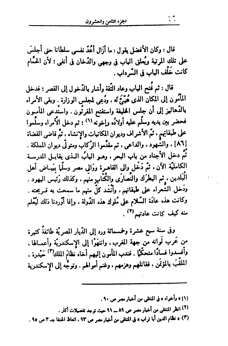 قال: وكان الأفضل يقول: ما أزال أعدّ نفسى سلطانا حتى أجلس على تلك المرتبة ويعلق الباب فى وجهى والدّخان فى أنفى؛ لأن الحمّام كانت خلف الباب فى السّرداب.