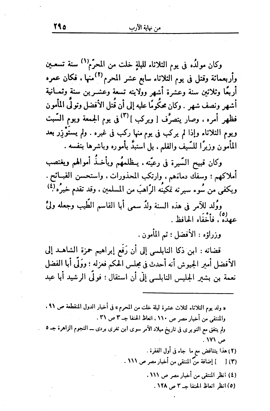 وكان مولده فى يوم الثلاثاء لليلة خلت من المحرّم «1» سنة تسعين وأربعمائة وقتل فى يوم الثلاثاء سابع عشر المحرم «2» منها، فكان عمره أربعا وثلاثين سنة وعشرة أشهر وولايته تسعة وعشرين سنة وثمانية أشهر ونصف شهر. وكان محكوما عليه إلى أن قتل الأفضل وتولّى المأمون فظهر أمره، وصار يتصرّف [ويركب] «3» فى يوم الجمعة ويوم السّبت ويوم الثلاثاء وإذا لم يركب فى يوم منها ركب فى غيره. ولم يستوزر بعد المأمون وزيرا للسّيف والقلم، بل استبدّ بأموره وباشرها بنفسه.