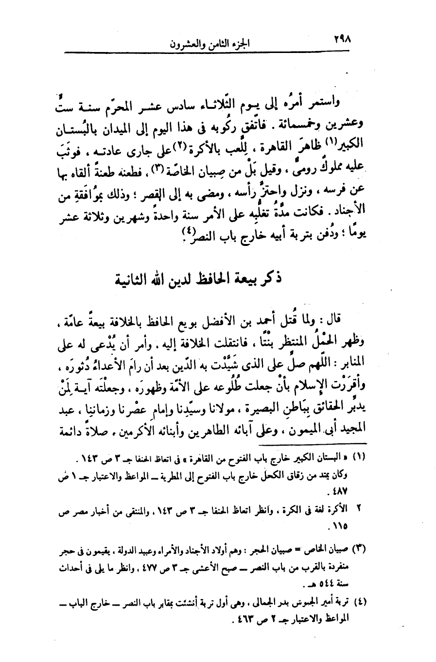 واستمر أمره إلى يوم الثّلاثاء سادس عشر المحرّم سنة ستّ وعشرين وخمسمائة. فاتّفق ركوبه فى هذا اليوم إلى الميدان بالبستان الكبير «1» ظاهر القاهرة، للّعب بالأكرة «2» على جارى عادته، فوثب عليه مملوك رومىّ، وقيل بل من صبيان الخاصّة «3» ، فطعنه طعنة ألقاه بها عن فرسه، ونزل واحتزّ رأسه، ومضى به إلى القصر؛ وذلك بموافقة من الأجناد. فكانت مدّة تغلّبه على الأمر سنة واحدة وشهرين وثلاثة عشر يوما؛ ودفن بتربة أبيه خارج باب النصر «4» .