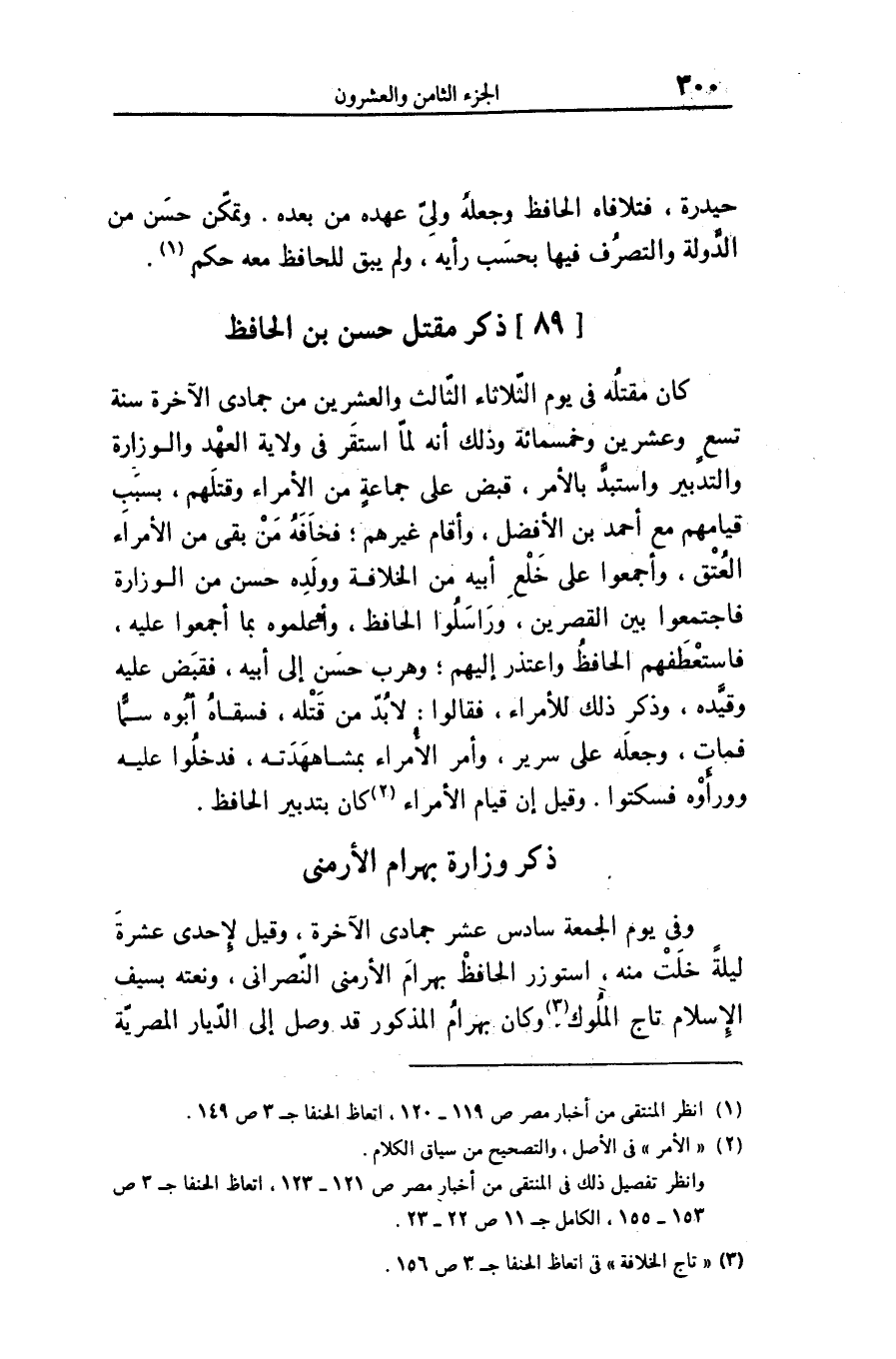 وفى يوم الجمعة سادس عشر جمادى الآخرة، وقيل لإحدى عشرة ليلة خلت منه، استوزر الحافظ بهرام الأرمنى النّصرانى، ونعته بسيف الإسلام تاج الملوك «3» وكان بهرام المذكور قد وصل إلى الدّيار المصريّة