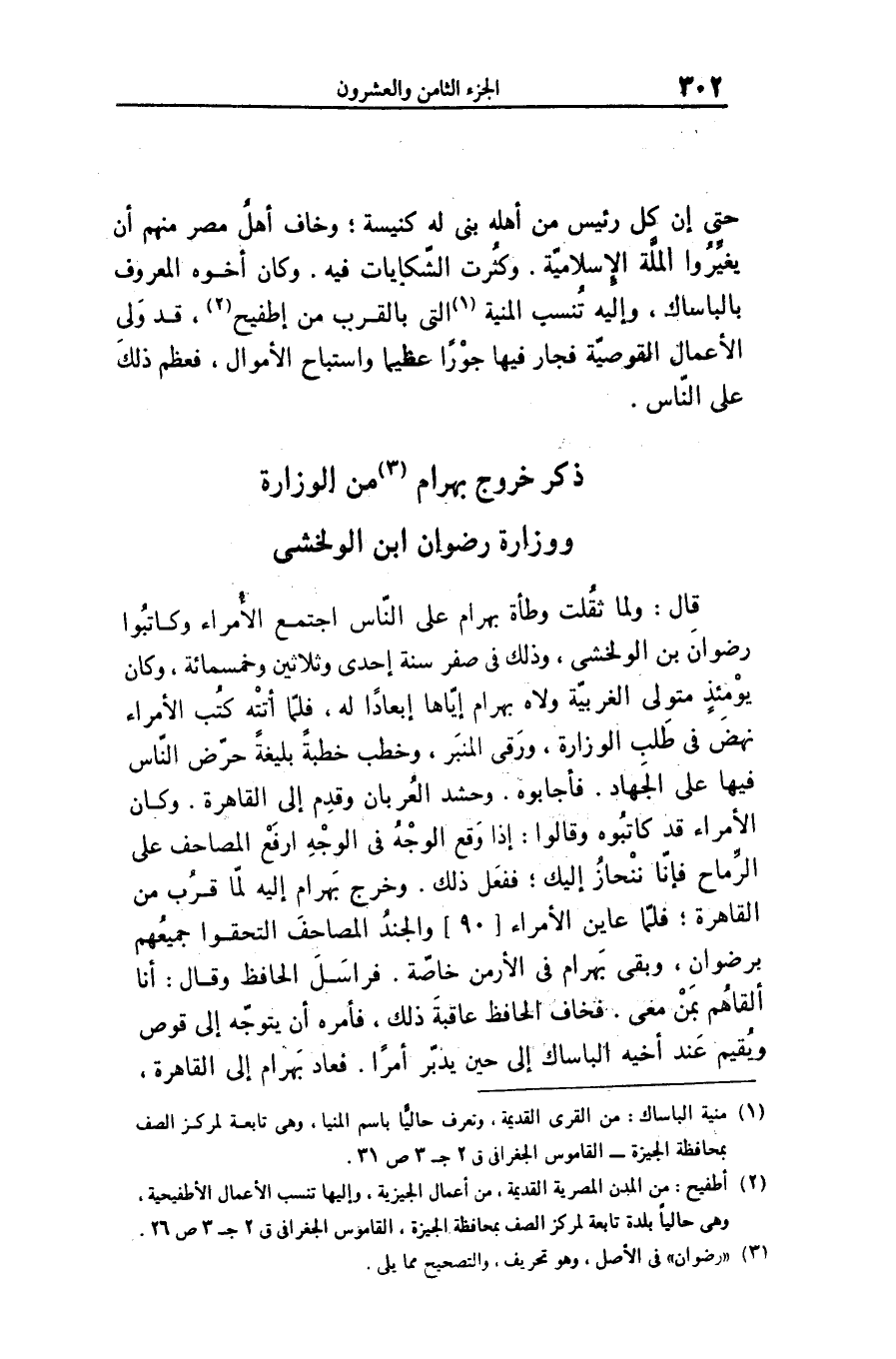 قال: ولما ثقلت وطأة بهرام على النّاس اجتمع الأمراء وكاتبوا رضوان بن الولخشى، وذلك فى صفر سنة إحدى وثلاثين وخمسمائة، وكان يومئذ متولى الغربيّة ولاه بهرام إيّاها إبعادا له، فلمّا أتته كتب الأمراء نهض فى طلب الوزارة، ورقى المنبر، وخطب خطبة بليغة حرّض النّاس فيها على الجهاد. فأجابوه. وحشد العربان وقدم إلى القاهرة. وكان الأمراء قد كاتبوه وقالوا: إذا وقع الوجه فى الوجه ارفع المصاحف على الرّماح فإنّا ننحاز إليك؛ ففعل ذلك. وخرج بهرام إليه لمّا قرب من القاهرة؛ فلمّا عاين الأمراء [90] والجند المصاحف التحقوا جميعهم برضوان، وبقى بهرام فى الأرمن خاصّة. فراسل الحافظ وقال: أنا ألقاهم بمن معى. فخاف الحافظ عاقبة ذلك، فأمره أن يتوجّه إلى قوص ويقيم عند أخيه الباساك إلى حين يدبّر أمرا. فعاد بهرام إلى القاهرة،