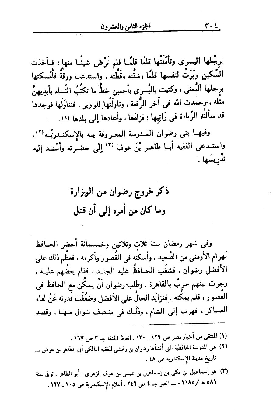 برجلها اليسرى وتأمّلتها قلما قلما فلم ترض شيئا منها؛ فأخذت السّكين وبرت لنفسها قلما وشقّته وقطّته، واستدعت ورقة فأمسكتها برجلها اليمنى، وكتبت باليسرى بأحسن خطّ ما تكتب النّساء بأيديهنّ مثله، وحمدت الله فى آخر الرّقعة، وناولتها للوزير. فتناولها فوجدها قد سألته الزّيادة فى راتبها؛ فزادها، وأعادها إلى بلدها «1» .