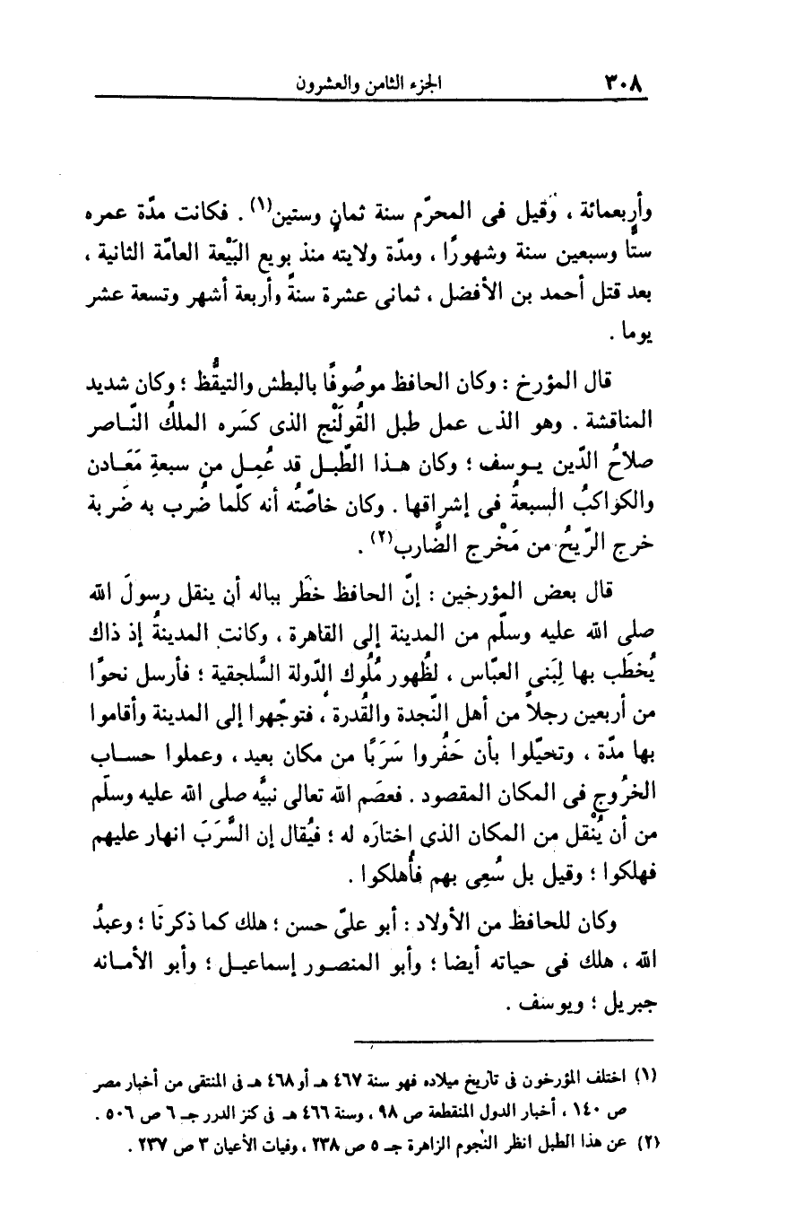 قال المؤرخ: وكان الحافظ موصوفا بالبطش والتيقّظ؛ وكان شديد المناقشة. وهو الذى عمل طبل القولنج الذى كسره الملك النّاصر صلاح الدّين يوسف؛ وكان هذا الطّبل قد عمل من سبعة معادن والكواكب السبعة فى إشراقها. وكان خاصّته أنه كلّما ضرب به ضربة خرج الرّيح من مخرج الضّارب «2» .