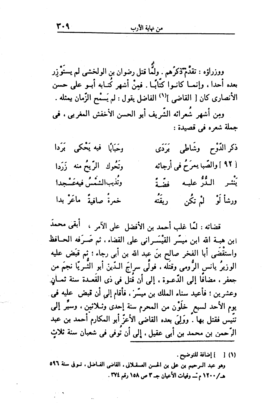 ووزراؤه: تقدّم ذكرهم. ولمّا قتل رضوان بن الولخشى لم يستوزر بعده أحدا، وإنما كانوا كتّابا. فمن أشهر كتابه أبو على حسن الأنصارى كان [القاضى] «1» الفاضل يقول: لم يسمح الزّمان يمثله.