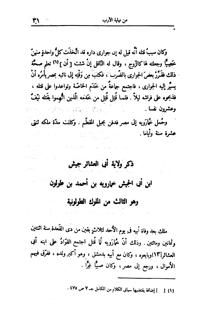 ذكر ولاية أبى العشائر جيش ابن أبى الجيش خمارويه بن أحمد بن طولون وهو الثالث من الملوك الطولونية