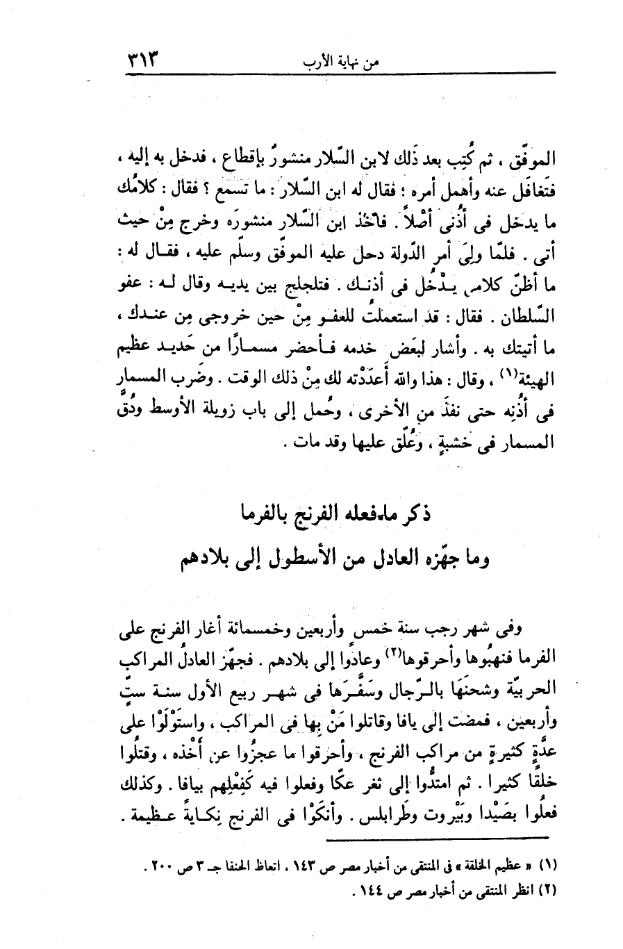 وفى شهر رجب سنة خمس وأربعين وخمسمائة أغار الفرنج على الفرما فنهبوها وأحرقوها «2» وعادوا إلى بلادهم. فجهّز العادل المراكب الحربيّة وشحنها بالرّجال وسفّرها فى شهر ربيع الأول سنة ستّ وأربعين، فمضت إلى يافا وقاتلوا من بها فى المراكب، واستولوا على عدّة كثيرة من مراكب الفرنج، وأحرقوا ما عجزوا عن أخذه، وقتلوا خلقا كثيرا. ثم امتدّوا إلى ثغر عكّا وفعلوا فيه كفعلهم بيافا. وكذلك فعلوا بصيدا وبيروت وطرابلس. وأنكوا فى الفرنج نكاية عظيمة.