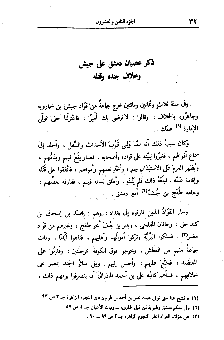 وكان سبب ذلك أنه لمّا ولى قرّب الأحداث والسّفل، وأخلد إلى سماع أقوالهم، فغيّروا نيّته على قواده وأصحابه، فصار يقع فيهم ويذمّهم، ويظهر العزم على الاستبدال بهم، وأخذ نعمهم وأموالهم، فاتّفقوا على قتله وإقامة عمّه. فبلغه ذلك فلم ينته، وأطلق لسانه فيهم، ففارقه بعضهم، وخلعه طغج بن جفّ «2» أمير دمشق.