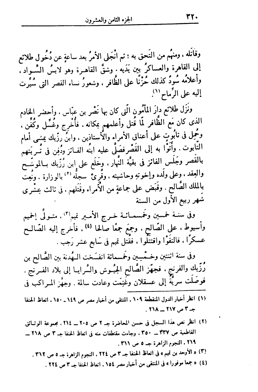 ونزل طلائع دار المأمون الّتى كان بها نصر بن عبّاس، وأحضر الخادم الذى كان مع الظّافر لمّا قتل وأعلمهم بمكانه، فأخرج وغسّل وكفّن، وحمل فى تابوت على أعناق الأمراء والأستاذين، وابن رزّيك يمشى أمام التّابوت. وأتوا به إلى القصر فصلّى عليه ابنه الفائز ودفن فى تربتهم بالقصر وجلس الفائز فى بقيّة النّهار، وخلع على ابن رزّيك بالموشّح والعقد، وعلى ولده وإخوته وحاشيته، وقرئ سجلّه «2» بالوزارة، ونعت بالملك الصّالح. وقبض على جماعة من الأمراء وقتلهم، فى ثالث عشرى شهر ربيع الأول من السنة وفى سنة خمسين وخمسمائة خرج الأمير تميم «3» ، متولّى إخميم وأسيوط، على الصّالح، وجمع جمعا صالحا «4» ، فأخرج إليه الصّالح عسكرا، فالتقوا واقتتلوا، فقتل تميم فى سابع عشر رجب.