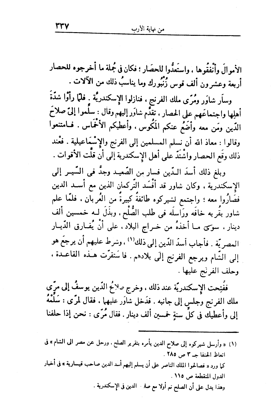 ففتحت الإسكندريّة عند ذلك، وخرج صلاح الدّين يوسف إلى مرّى ملك الفرنج وجلس إلى جانبه. فدخل شاور عليهما، فقال لمرّى: سلّمه إلى وأعطيك فى كلّ سنة خمسين ألف دينار. فقال مرّى: نحن إذا حلفنا