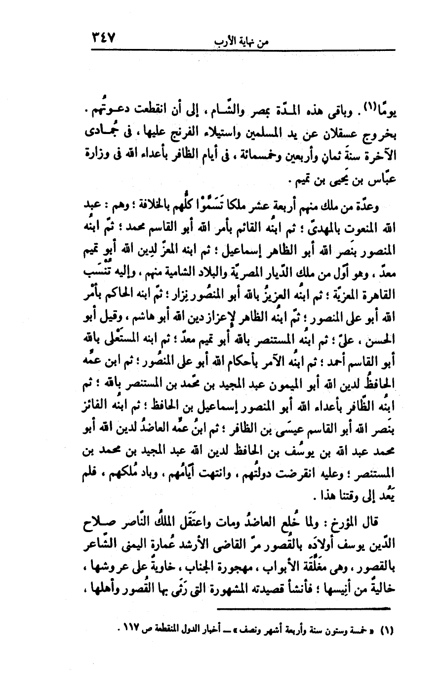 بخروج عسقلان عن يد المسلمين واستيلاء الفرنج عليها، فى جمادى الآخرة سنة ثمان وأربعين وخمسمائة، فى أيام الظافر بأعداء الله فى وزارة عبّاس بن يحيى بن تميم.