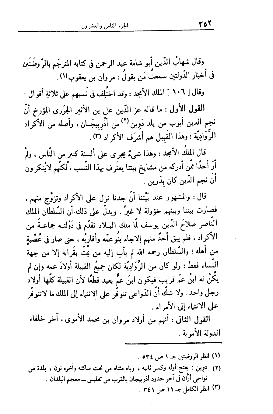 قال: والمشهور عند بيتنا أنّ جدنا نزل على الأكراد وتزوّج منهم، فصارت بيننا وبينهم خؤولة لا غير. ويدلّ على ذلك أن السّلطان الملك النّاصر صلاح الدّين يوسف لمّا ملك البلاد تقدّم فى دولته جماعة من الأكراد، فلم يبق أحد منهم إلا جاء بنو عمّه وأقاربه، حتى صار فى عصبة من أهله؛ والسّلطان رحمه الله لم يأت إليه من يمتّ بقرابة إلا من جهة النّساء فقط؛ ولو كان من الرّواديّة لكان جميع القبيلة أولاد عمه وإن لم يكن له ابن عمّ قريب فيكون ابن عمّ بعيد قطعا لأن القبيلة كلّها أولاد رجل واحد. ولا شكّ أنّ الدّواعى تتوفّر على الانتماء إلى الملك ما لا تتوفّر على الانتماء إلى الأمراء.