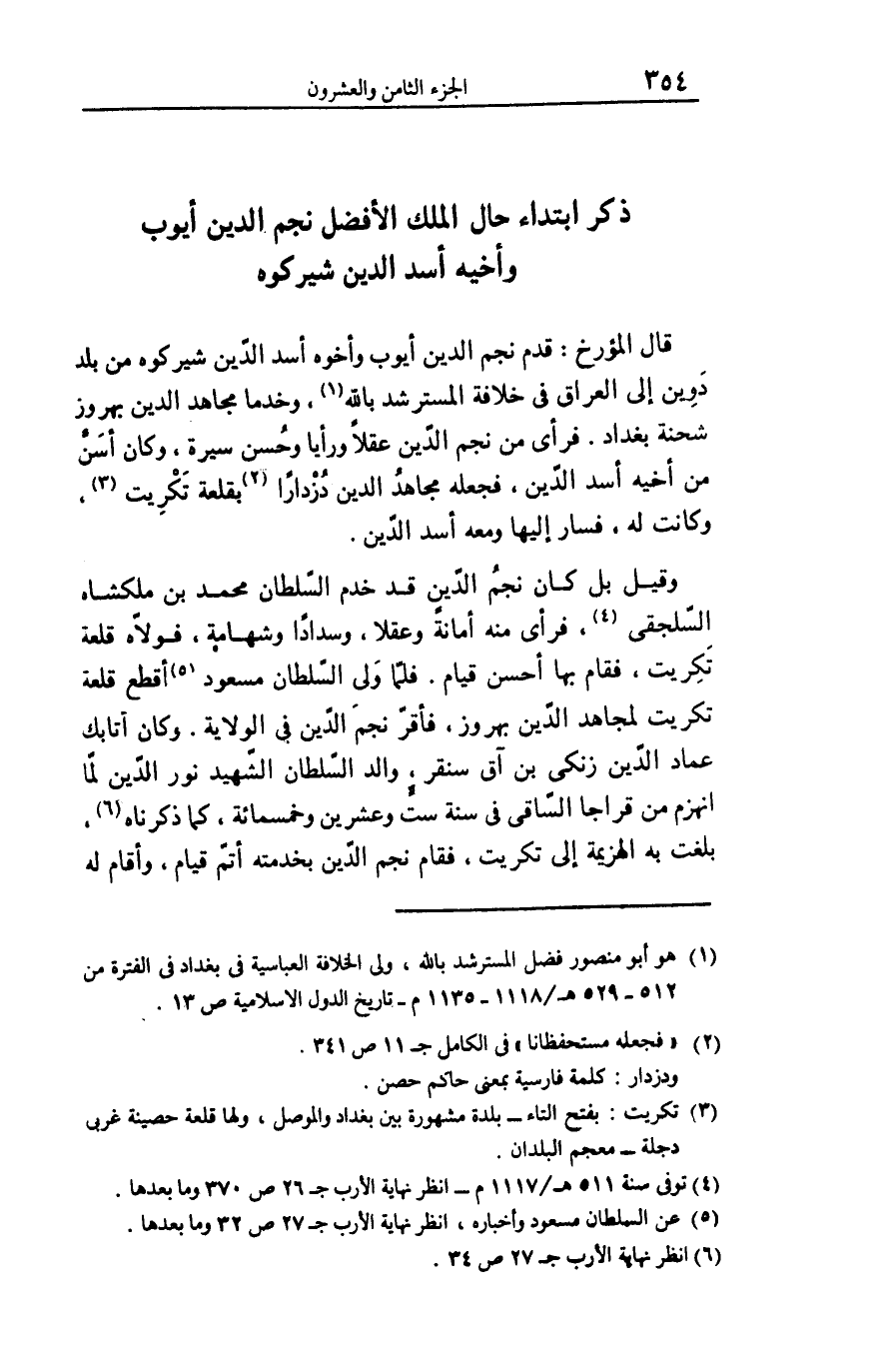 وقيل بل كان نجم الدّين قد خدم السّلطان محمد بن ملكشاه السّلجقى «4» ، فرأى منه أمانة وعقلا، وسدادا وشهامة، فولّاه قلعة تكريت، فقام بها أحسن قيام. فلمّا ولى السّلطان مسعود «5» أقطع قلعة تكريت لمجاهد الدّين بهروز، فأقرّ نجم الدّين فى الولاية. وكان أتابك عماد الدّين زنكى بن آق سنقر، والد السّلطان الشّهيد نور الدّين لمّا انهزم من قراجا السّاقى فى سنة ستّ وعشرين وخمسمائة، كما ذكرناه «6» ، بلغت به الهزيمة إلى تكريت، فقام نجم الدّين بخدمته أتمّ قيام، وأقام له