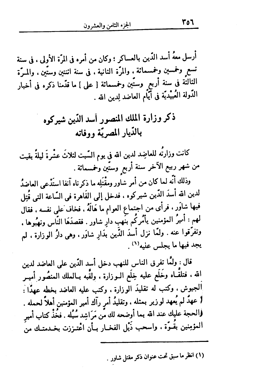وذلك أنّه لما كان من أمر شاور ومقتله ما ذكرناه آنفا استدعى العاضد لدين الله أسد الدّين شيركوه، فدخل إلى القاهرة فى السّاعة التى قتل فيها شاور، فرأى من اجتماع العوام ما هاله، فخاف على نفسه، فقال لهم: أمير المؤمنين يأمركم بنهب دار شاور. فقصدها النّاس ونهبوها، وتفرّقوا عنه. ولمّا نزل أسد الدّين بدار شاور، وهى دار الوزارة، لم يجد فيها ما يجلس عليه «1» .