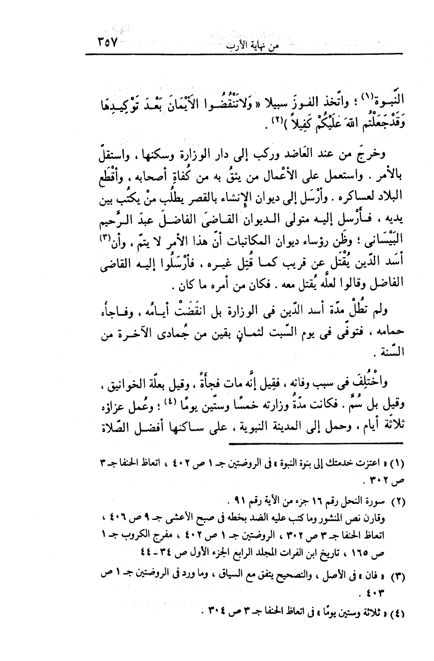 واختلف فى سبب وفاته، فقيل إنّه مات فجأة، وقيل بعلّة الخوانيق، وقيل بل سمّ. فكانت مدّة وزارته خمسا وستّين يوما «4» ؛ وعمل عزاؤه ثلاثة أيام، وحمل إلى المدينة النبوية، على ساكنها أفضل الصّلاة