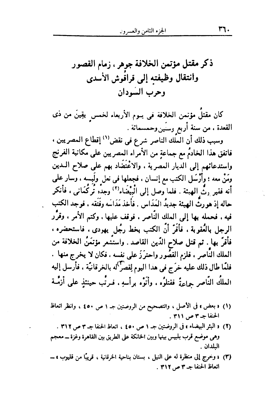 ذكر مقتل مؤتمن الخلافة جوهر، زمام القصور وانتقال وظيفته إلى قراقوش الأسدى وحرب السودان