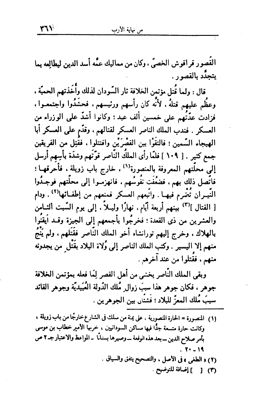 قال: ولما قتل مؤتمن الخلافة ثار السّودان لذلك وأخذتهم الحميّة، وعظم عليهم قتله، لأنّه كان رأسهم ورئيسهم، فحشدوا واجتمعوا، فزادت عدّتهم على خمسين ألف عبد؛ وكانوا أشدّ على الوزراء من العسكر. فندب الملك الناصر العسكر لقتالهم، وقدّم على العسكر أبا الهيجاء السّمين؛ فالتقوا بين القصرين واقتتلوا، فقتل من الفريقين جمع كثير. [109] فلمّا رأى الملك النّاصر قوّتهم وشدة بأسهم أرسل إلى محلّتهم المعروفة بالمنصورة «1» ، خارج باب زويلة، فأحرقها؛ فاتّصل ذلك بهم، فضعفت نفوسهم، فانهزموا إلى محلّتهم فوجدوا النّيران تضرم فيها. واتّبعهم العسكر فمنعهم من إطفائها «2» . ودام [القتال] «3» بينهم أربعة أيّام، نهارا وليلا، إلى يوم السّبت الثامن والعشرين من ذى القعدة؛ فخرجوا بأجمعهم إلى الجيزة وقد أيقنوا بالهلاك، وخرج إليهم تورانشاه أخو الملك النّاصر فقتلهم، ولم ينج منهم إلا اليسير. وكتب الملك الناصر إلى ولاة البلاد بقتل من يجدونه منهم، فقتلوا من عند آخرهم.