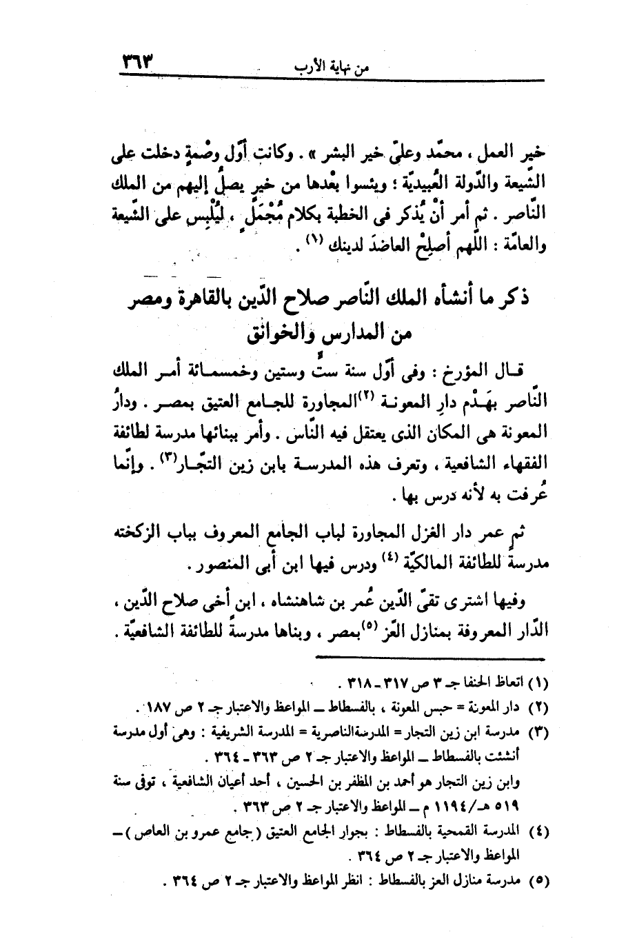 وفيها اشترى تقىّ الدّين عمر بن شاهنشاه، ابن أخى صلاح الدّين، الدّار المعروفة بمنازل العّز «5» بمصر، وبناها مدرسة للطائفة الشافعيّة.