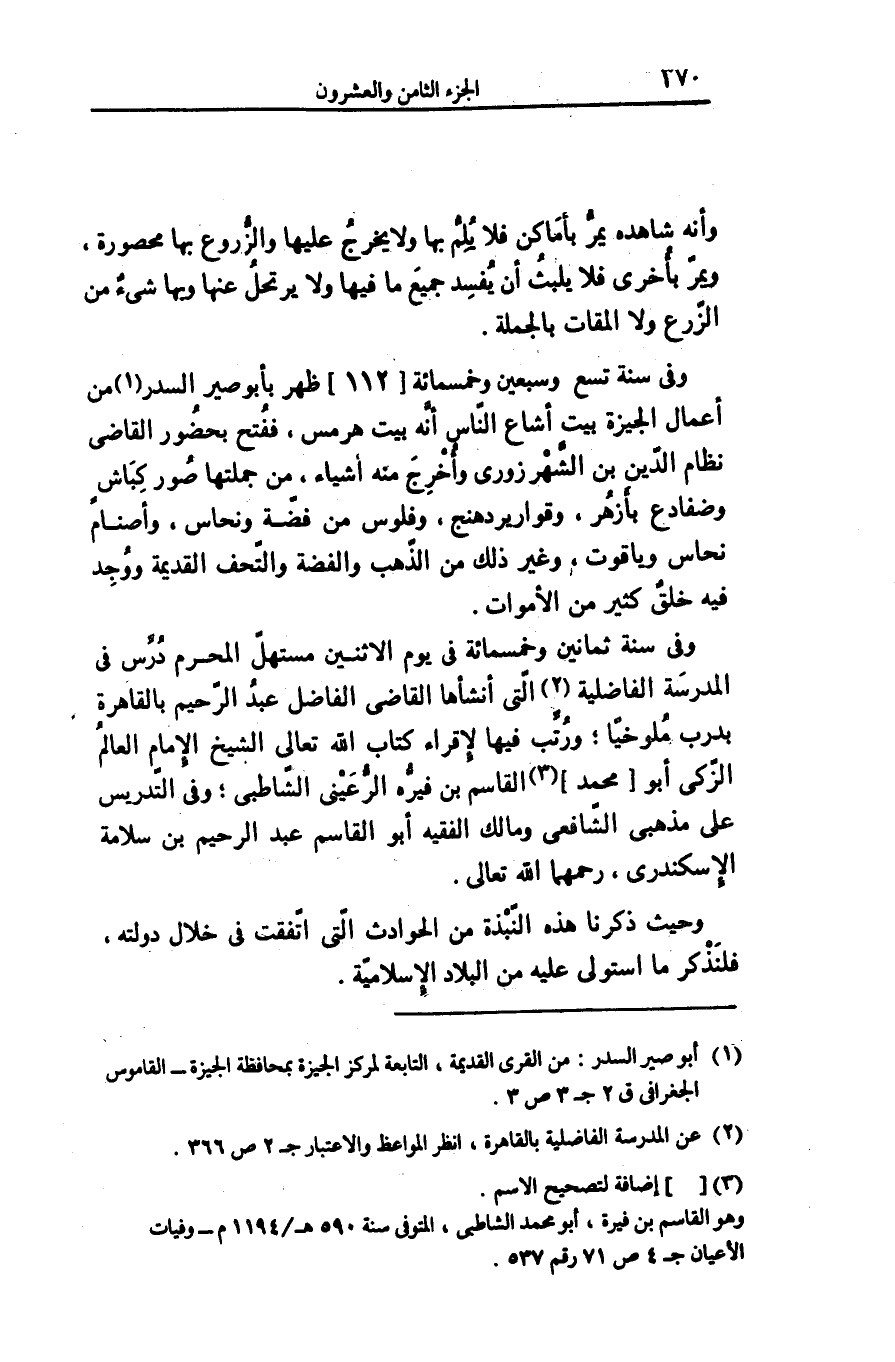 وفى سنة ثمانين وخمسمائة فى يوم الاثنين مستهلّ المحرم درّس فى المدرسة الفاضلية «2» الّتى أنشأها القاضى الفاضل عبد الرّحيم بالقاهرة بدرب ملوخيّا؛ ورتّب فيها لإقراء كتاب الله تعالى الشيخ الإمام العالم الزّكى أبو [محمد] «3» القاسم بن فيرّه الرّعينى الشّاطبى؛ وفى التّدريس على مذهبى الشّافعى ومالك الفقيه أبو القاسم عبد الرحيم بن سلامة الإسكندرى، رحمهما الله تعالى.