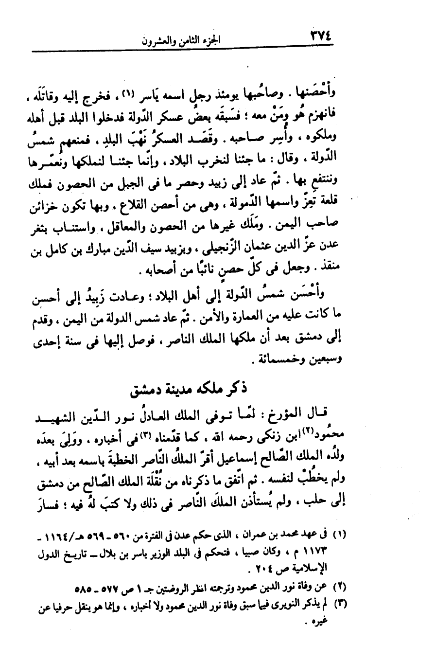 وأحصنها. وصاحبها يومئذ رجل اسمه ياسر «1» ، فخرج إليه وقاتله، فانهزم هو ومن معه؛ فسبقه بعض عسكر الدّولة فدخلوا البلد قبل أهله وملكوه، وأسر صاحبه. وقصد العسكر نهب البلد، فمنعهم شمس الدّولة، وقال: ما جئنا لنخرب البلاد، وإنّما جئنا لنملكها ونعمّرها وننتفع بها. ثمّ عاد إلى زبيد وحصر ما فى الجبل من الحصون فملك قلعة تعزّ واسمها الدّمولة، وهى من أحصن القلاع، وبها تكون خزائن صاحب اليمن. وملك غيرها من الحصون والمعاقل، واستناب بثغر عدن عزّ الدين عثمان الزّنجيلى، وبزبيد سيف الدّين مبارك بن كامل بن منقذ. وجعل فى كلّ حصن نائبا من أصحابه.