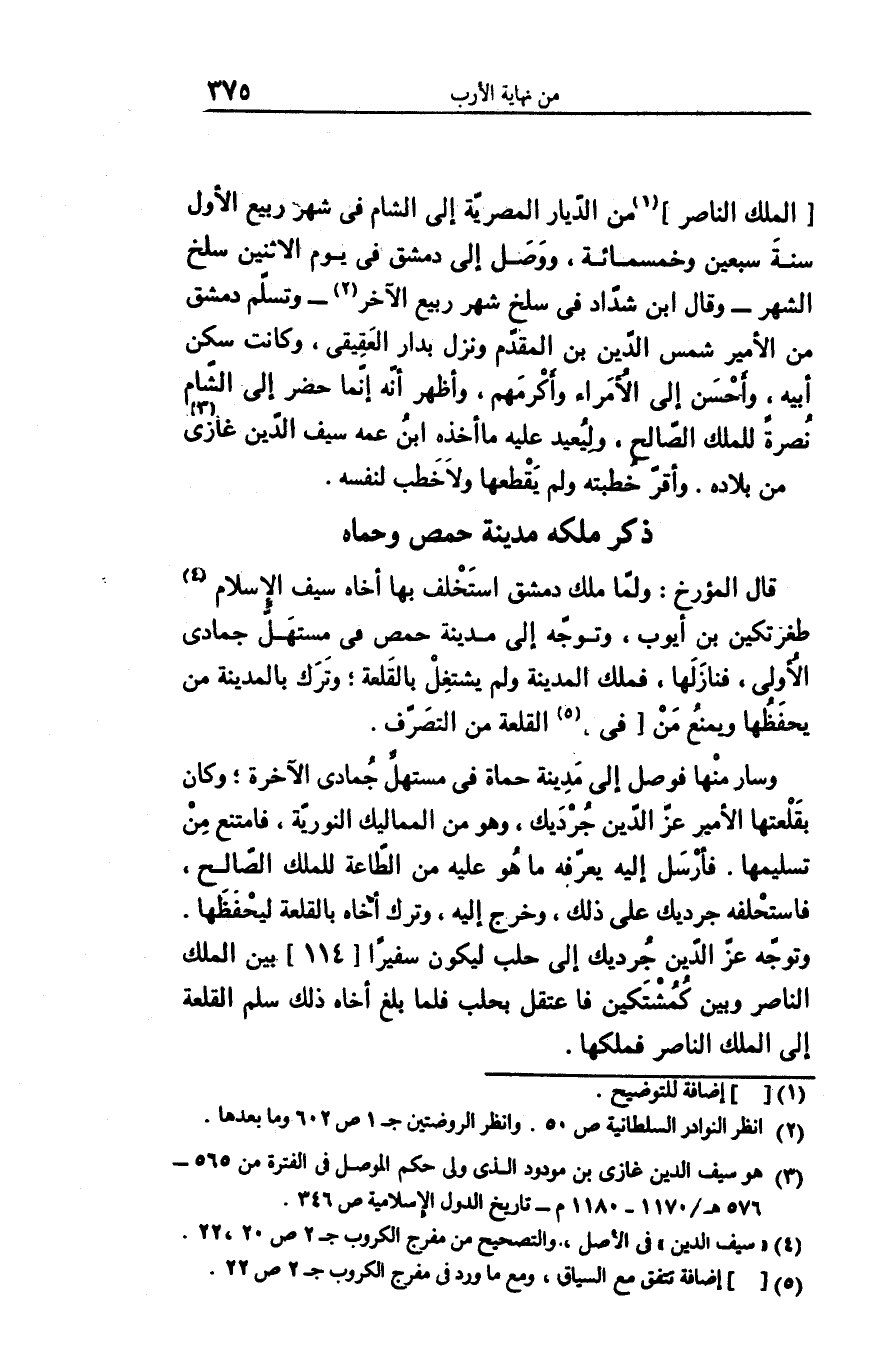 [الملك الناصر] «1» من الدّيار المصريّة إلى الشام فى شهر ربيع الأول سنة سبعين وخمسمائة، ووصل إلى دمشق فى يوم الاثنين سلخ الشهر- وقال ابن شدّاد فى سلخ شهر ربيع الآخر «2» - وتسلّم دمشق من الأمير شمس الدّين بن المقدّم ونزل بدار العقيقى، وكانت سكن أبيه، وأحسن إلى الأمراء وأكرمهم، وأظهر أنّه إنّما حضر إلى الشّام نصرة للملك الصّالح، وليعيد عليه ما أخذه ابن عمه سيف الدّين غازى «3» من بلاده. وأقرّ خطبته ولم يقطعها ولا خطب لنفسه.