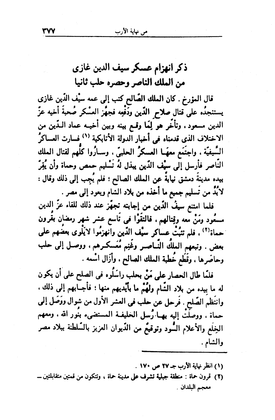 فلما امتنع سيف الدّين من إجابته تجهّز عند ذلك للقاء عزّ الدين مسعود ومن معه وقتالهم، فالتقوا فى تاسع عشر شهر رمضان بقرون حماة «2» ، فلم تثبت عساكر سيف الدّين وانهزموا لا يلوى بعضهم على بعض. وتبعهم الملك النّاصر وغنم معسكرهم، ووصل إلى حلب وحاصرها، وقطع خطبة الملك الصالح، وأزال اسمه.