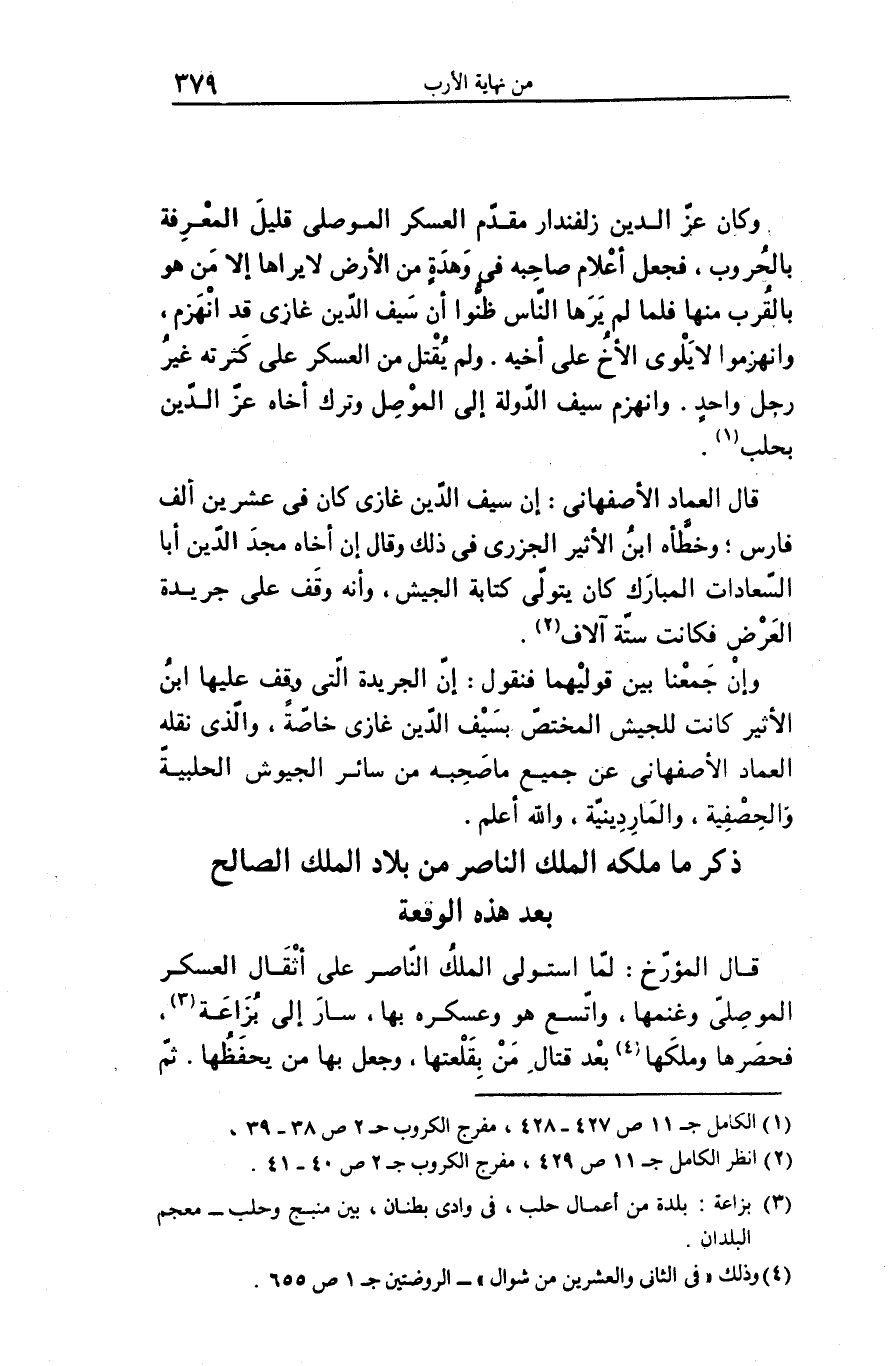 وإن جمعنا بين قوليهما فنقول: إنّ الجريدة الّتى وقف عليها ابن الأثير كانت للجيش المختصّ بسيف الدّين غازى خاصّة، والّذى نقله العماد الأصفهانى عن جميع ما صحبه من سائر الجيوش الحلبية والحصفية، والماردينيّة، والله أعلم.