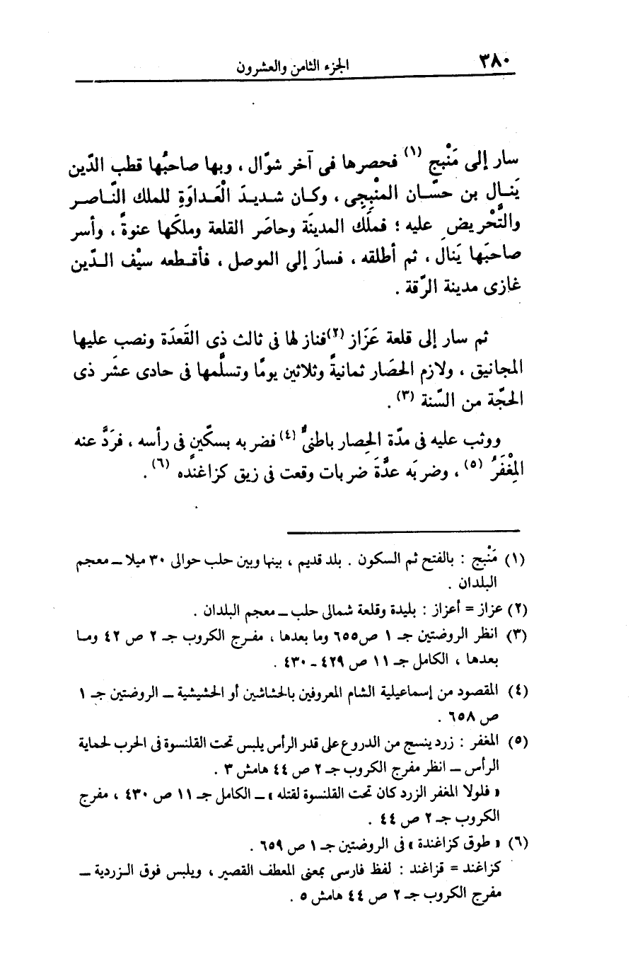 ووثب عليه فى مدّة الحصار باطنىّ «4» فضربه بسكّين فى رأسه، فردّ عنه المغفر «5» ، وضربه عدّة ضربات وقعت فى زيق كزاغنده «6» .