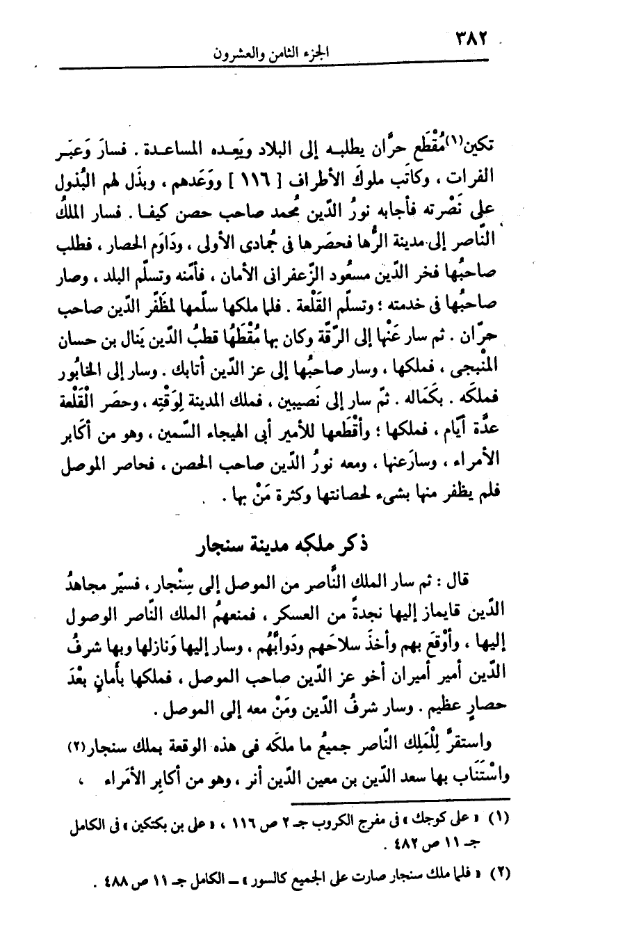قال: ثم سار الملك النّاصر من الموصل إلى سنجار، فسيّر مجاهد الدّين قايماز إليها نجدة من العسكر، فمنعهم الملك النّاصر الوصول إليها، وأوقع بهم وأخذ سلاحهم ودوابّهم، وسار إليها ونازلها وبها شرف الدّين أمير أميران أخو عز الدّين صاحب الموصل، فملكها بأمان بعد حصار عظيم. وسار شرف الدّين ومن معه إلى الموصل.